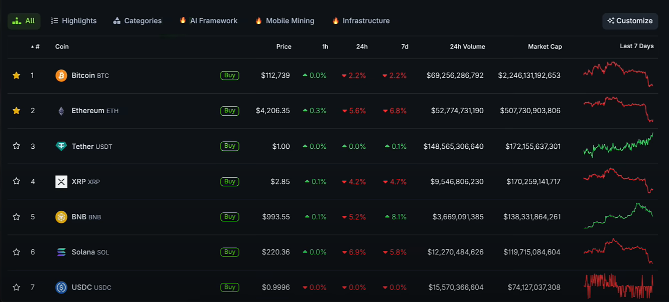 Sau khi giảm xuống dưới mức 111,700 USD, giá của Bitcoin đã hồi phục lên mức khoảng 112,000 USD. Trong khi đó, nhiều altcoin lớn đã ghi nhận sự sụt giảm đáng kể. Vốn hóa thị trường tiền điện tử cũng đã điều chỉnh về mức khoảng 3.9 nghìn tỷ USD.