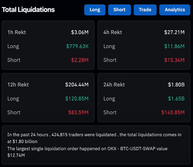 Đáng chú ý, trong vòng 24 giờ, có tới 1.8 tỷ USD lệnh bị thanh lý, chủ yếu là lệnh mua (Long) trị giá 1.65 tỷ USD, trong đó gần 1 tỷ USD bị “thổi bay” chỉ trong 20 phút – mức kỷ lục trong 6 tháng qua. Bybit đứng đầu với 944 triệu USD lệnh thanh lý, tiếp theo là Binance và OKX.