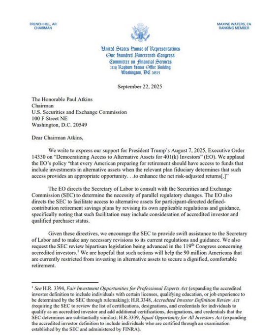 Trong thư gửi Chủ tịch SEC Paul Atkins, các lãnh đạo của Ủy ban Dịch vụ Tài chính Hạ viện Hoa Kỳ đã bày tỏ sự ủng hộ đối với Sắc lệnh Hành pháp 14330 của Tổng thống Trump, ban hành vào ngày 7/8/2025, cho phép nhà đầu tư trong quỹ hưu trí 401(k) tiếp cận các tài sản thay thế như Bitcoin và vàng nhằm tối ưu hóa lợi nhuận và quản lý rủi ro.