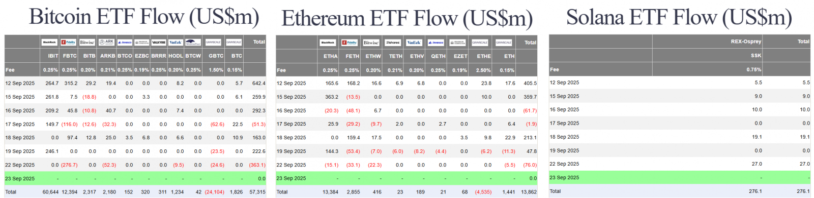 Các quỹ giao dịch BTC ETF thứ hai tại Hoa Kỳ đã chứng kiến dòng tiền rời đi lên đến 363 triệu USD. Tình trạng tương tự cũng xảy ra với ETH spot ETF, khi mà dòng tiền rời khỏi đạt 76 triệu USD. Trong khi đó, quỹ giao dịch SOL ETF lại nhận được dòng tiền vào 27 triệu USD.