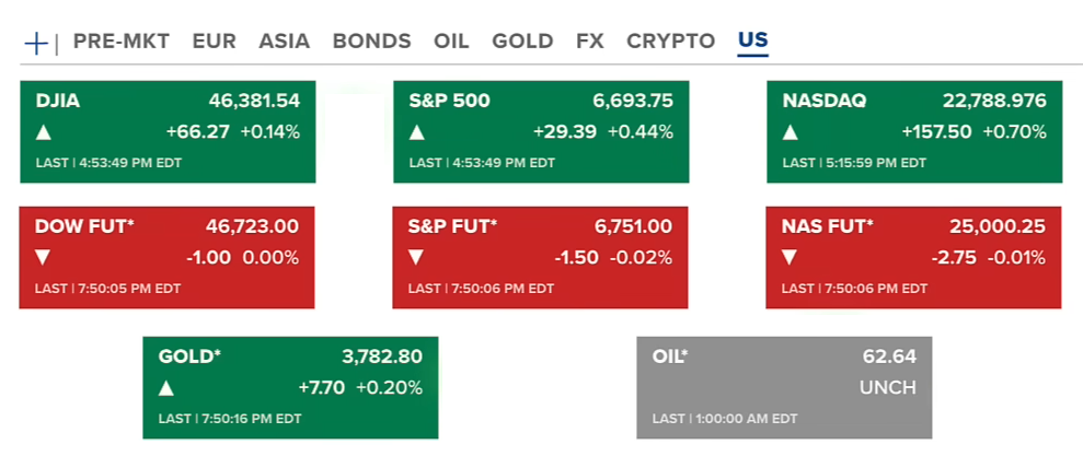 Trong ngày 22/09, thị trường chứng khoán Mỹ thể hiện sự lạc quan sau khi Cục Dự trữ Liên bang Hoa Kỳ (Fed) giảm lãi suất và cả ba chỉ số đều tăng, với Nasdaq tăng mạnh nhất lên 0.7%. Hợp đồng tương lai chứng khoán duy trì ổn định nhưng có dấu hiệu hướng xuống. Giá dầu vẫn dao động quanh mức 62 USD/thùng, trong khi giá vàng tăng nhẹ lên 3782 USD/ounce.