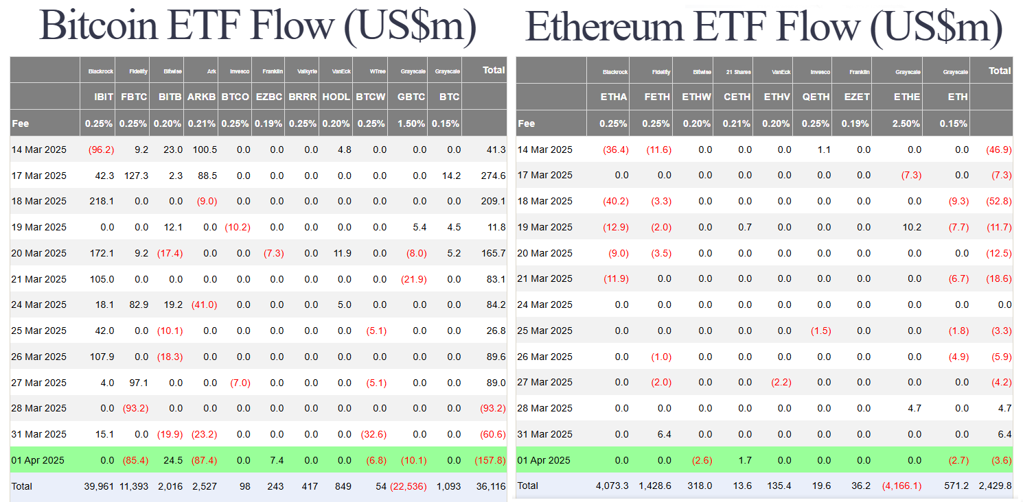 Các quỹ BTC spot ETF Hoa Kỳ kết thúc phiên thứ ba (01/04) vẫn tiếp tục có dòng tiền rời khỏi với tổng 157.8 triệu USD. Tương tự, ETH spot ETF cũng có dòng tiền ra 3.6 triệu USD.