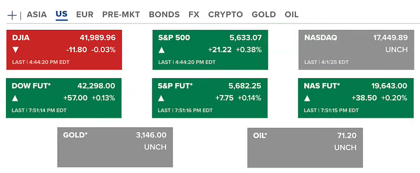 Chứng khoán Hoa Kỳ thứ ba (01/04) đóng cửa với Dow Jones giảm không đáng kể 0.03%, S&P 500 tăng 0.38%, còn Nasdaq không thay đổi. Hợp đồng tương lai của chứng khoán tăng nhẹ. Dầu và vàng ở mức giá lần lượt 71 USD/thùng và 3146 USD/ounce.