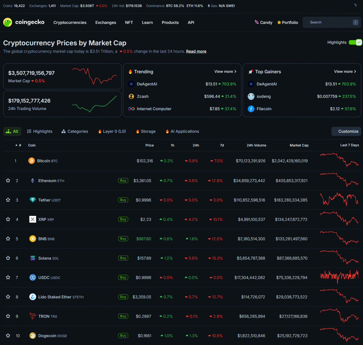 Bitcoin sau khi hồi nhẹ lại trở về quanh 102,000 USD. Hầu hết altcoin lớn cũng tiếp tục giảm. Vốn hóa thị trường crypto vẫn giảm về 3.5 nghìn tỷ USD.