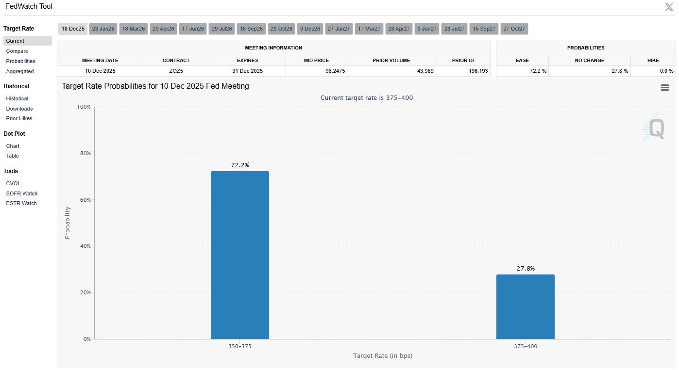 Hợp đồng tương lai của Fed trên CME cho thấy, đa sô các nhà đầu tư vẫn cho rằng Fed sẽ tiếp tục giảm 0.25% lãi suất trong cuộc họp tháng 12.
