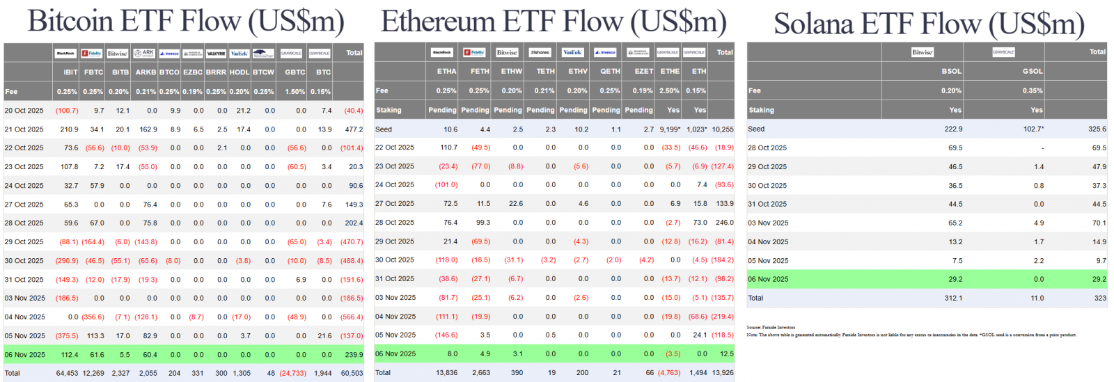 Các quỹ BTC spot ETF Hoa Kỳ trong thứ năm có dòng tiền vào nhẹ trở lại với tổng 239.9 triệu USD. ETH spot ETF cũng có 12.5 triệu USD tiền vào. SOL ETF vẫn tiếp tục có dòng tiền vào đều đặn với 29.2 triệu USD.