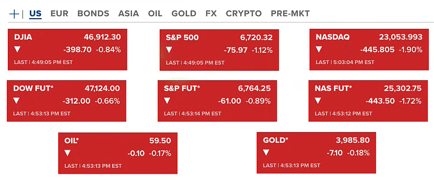Chứng khoán Hoa Kỳ tiếp tục giảm ở cả ba chỉ số trong thứ năm (06/11-US) với Nasdaq giảm nhiều nhất 1.9%. Hợp đồng tương lai của chứng khoán cũng tiếp tục giảm. Dầu giảm về 59.5 USD/thùng. Còn Vàng cũng giảm về 3985 USD/ounce.