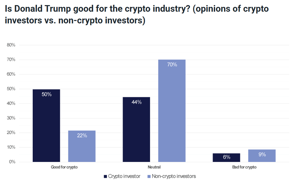 Nhà đầu tư crypto có góc nhìn tích cực hơn, với 50% đánh giá Trump có lợi, 44% trung lập và chỉ 6% cho rằng ông không tốt cho ngành.