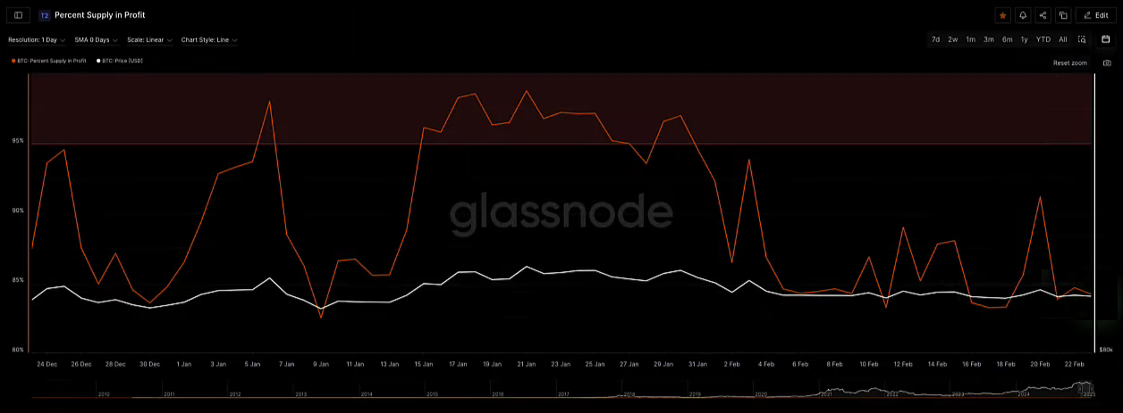 Tỷ lệ BTC có lời cũng giảm nhẹ về 84.1%. Đây là mức thấp hơn nhiều so với mức giá này thời điểm trước đây.