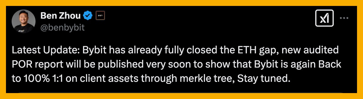Sau đó, CEO của Bybit tuyên bố rằng Bybit đã hoàn toàn bù đắp số ETH bị mất. Báo cáo Proof of Reserves (POR) mới đã được kiểm toán sẽ sớm được công bố để chứng minh rằng Bybit một lần nữa đạt tỷ lệ 1:1, đảm bảo 100% tài sản của khách hàng.