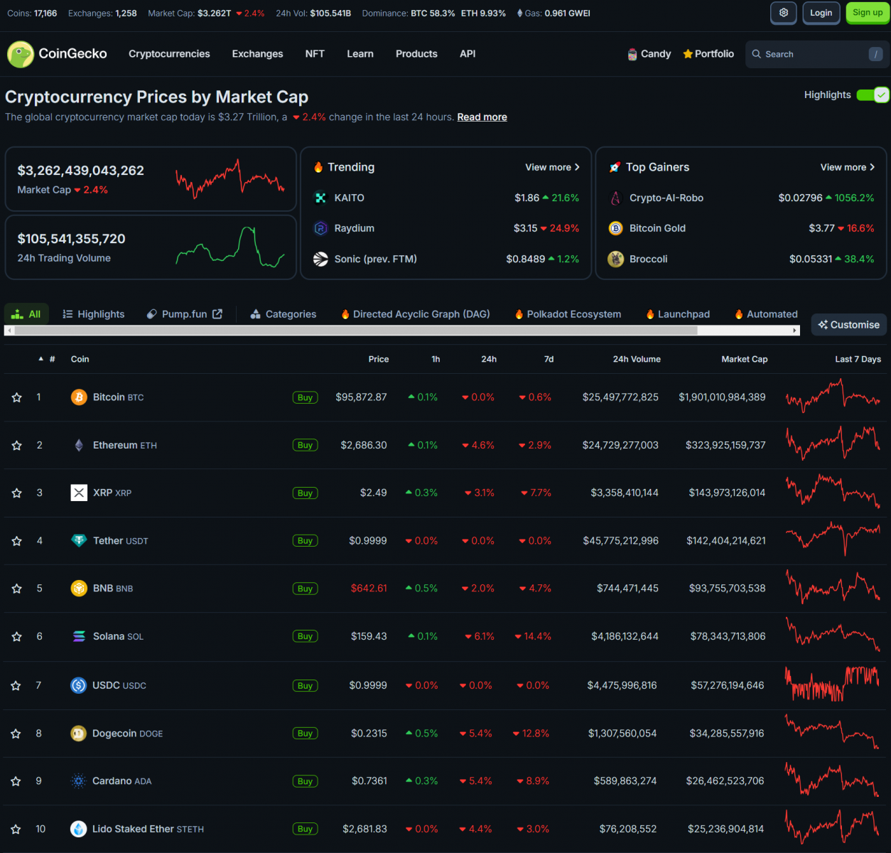Bitcoin cũng đã giảm và hồi nhẹ về trên 95,000 USD sau đợt giảm bởi tin Bybit bị tấn công cuối tuần vừa qua. Các altcoin lớn đều giảm. Vốn hóa thị trường crypto là 3.26 nghìn tỷ USD.