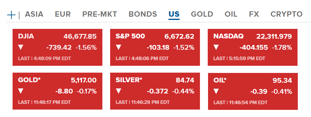 Chứng khoán Hoa Kỳ thứ năm (12/03-US) kết thúc phiên cả ba chỉ số giảm đang kể, với mức giảm cao nhất là 1.78% của Nasdaq. Hợp đồng vàng và bạc đều giảm nhẹ xuống lần lượt quanh 5117 USD/ounce và 84.74 USD/ounce. Dầu tăng mạnh sau đó chiều chỉnh quanh 95.34 USD/thùng.
