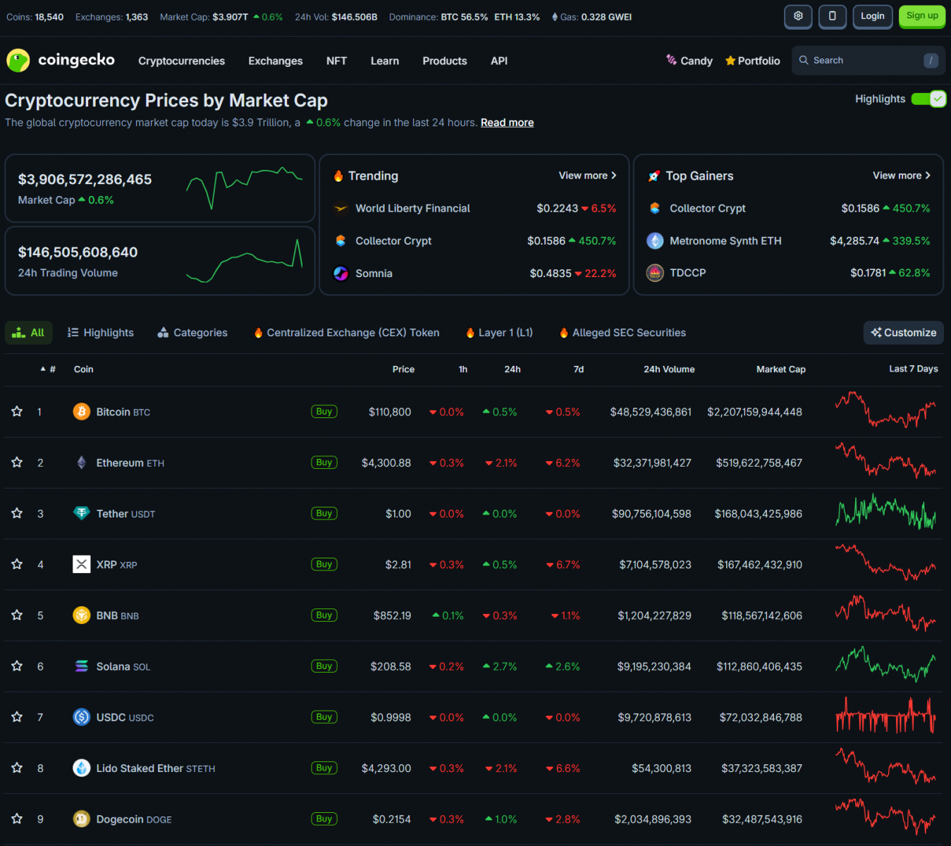Bitcoin ở quanh mức 110,000 USD, trở về giá trước khi điều chỉnh ngày thứ 6 tuần trước. Các altcoin lớn phần lớn đi ngang, hoặc tăng/giảm nhẹ. Vốn hóa thị trường crypto là 3.9 nghìn tỷ USD.