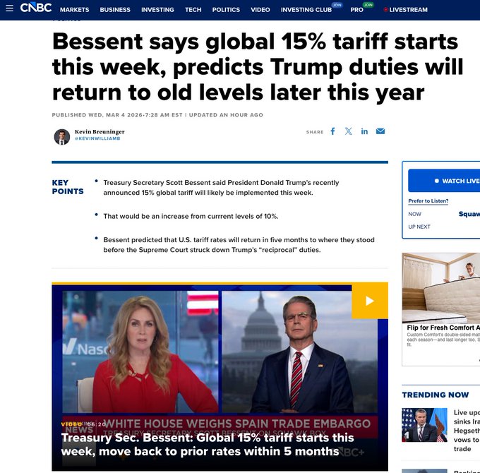 Bên cạnh đó, một thông tin khác liên quan đến chính sách thương mại cũng được làm rõ. Trước đó đã có sự nhầm lẫn về mức thuế quan toàn cầu do Tổng thống Donald Trump đề xuất. Ban đầu mức thuế được nhắc tới là 10%, sau đó tăng lên 15%, trong khi thông báo gửi tới cơ quan hải quan lại ghi nhận mức 10%. Trong cuộc phỏng vấn với CBC, Bộ trưởng Tài chính Scott Bessent đã xác nhận rằng mức thuế quan toàn cầu dự kiến sẽ là 15%, đúng như tuyên bố trước đó của Tổng thống Trump. Sự chênh lệch trước đây chủ yếu do độ trễ trong quá trình triển khai và truyền đạt chính sách.