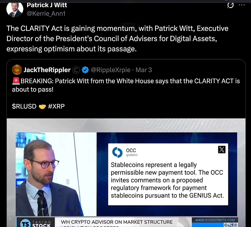 Ban đầu, Nhà Trắng được cho là có xu hướng ủng hộ phía ngân hàng để thúc đẩy quá trình thông qua luật. Tuy nhiên, trong một cuộc phỏng vấn gần đây, Patrick Witt là người đứng đầu bộ phận cố vấn crypto của Nhà Trắng, cho rằng các công ty crypto đã nhượng bộ đáng kể và phía ngân hàng cũng cần có động thái tương tự để đạt được thỏa hiệp. Việc thông qua luật được xem là cấp bách, bởi nếu Quốc hội rơi vào tình trạng chia rẽ sau bầu cử giữa nhiệm kỳ, quá trình này có thể bị trì hoãn thêm nhiều năm.