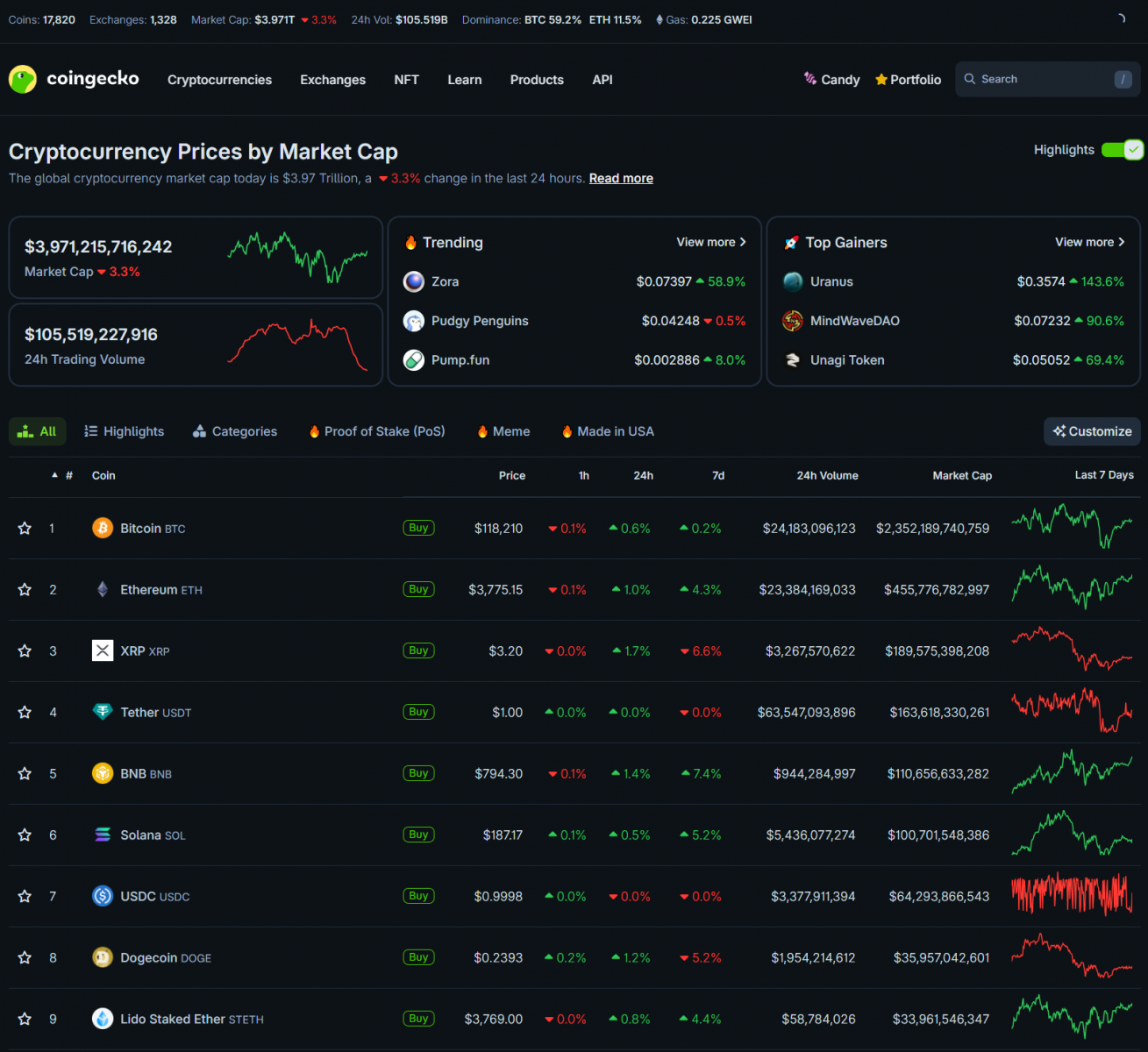 Bitcoin ngày qua đã tăng trở lại lên quanh 118,000 USD sau những ngày nhiều biến động, có những thời điểm đã giảm về 114,000 USD. Hầu hết altcoin tăng nhẹ hoặc đi ngang. Vốn hóa thị trường crypto ở mức 3.97 nghìn tỷ USD.