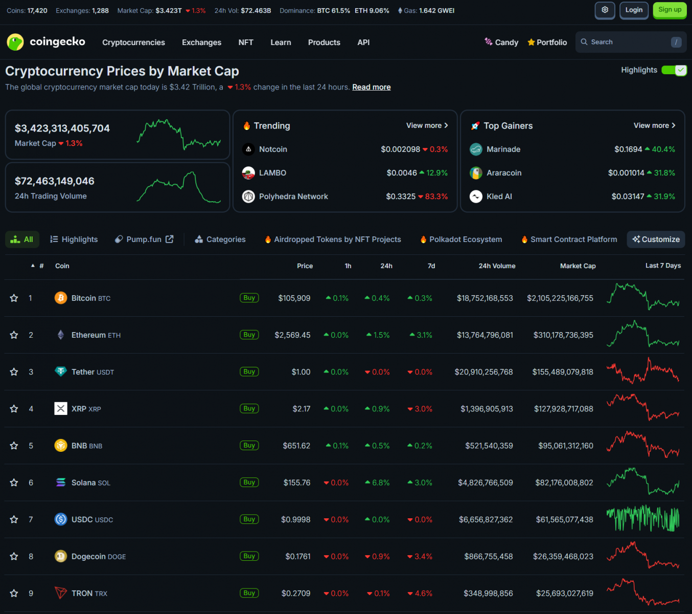 Bitcoin ở quanh mức 105,000 USD. MỘt số altcoin lớn tăng nhẹ theo BTC, một số khác vẫn giảm nhẹ. vốn hóa thị trường crypto giảm còn 3.423 nghìn tỷ USD.