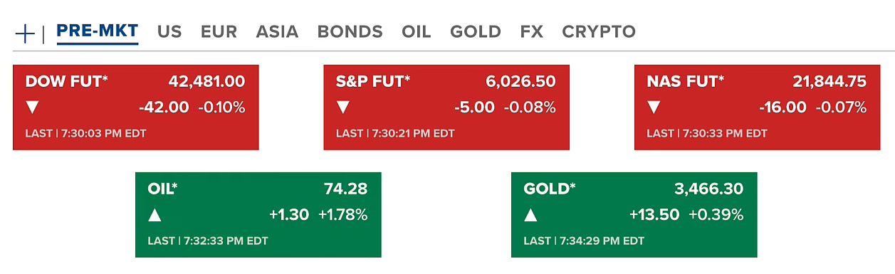 Chủ nhật tại Hoa Kỳ (15/06-US), thị trường hợp đồng tương lai của chứng khoán giảm nhẹ. Giá dầu tăng lên 74.28 USD/thùng. Vàng cũng tiếp tục tăng lên 3466 USD/ounce.
