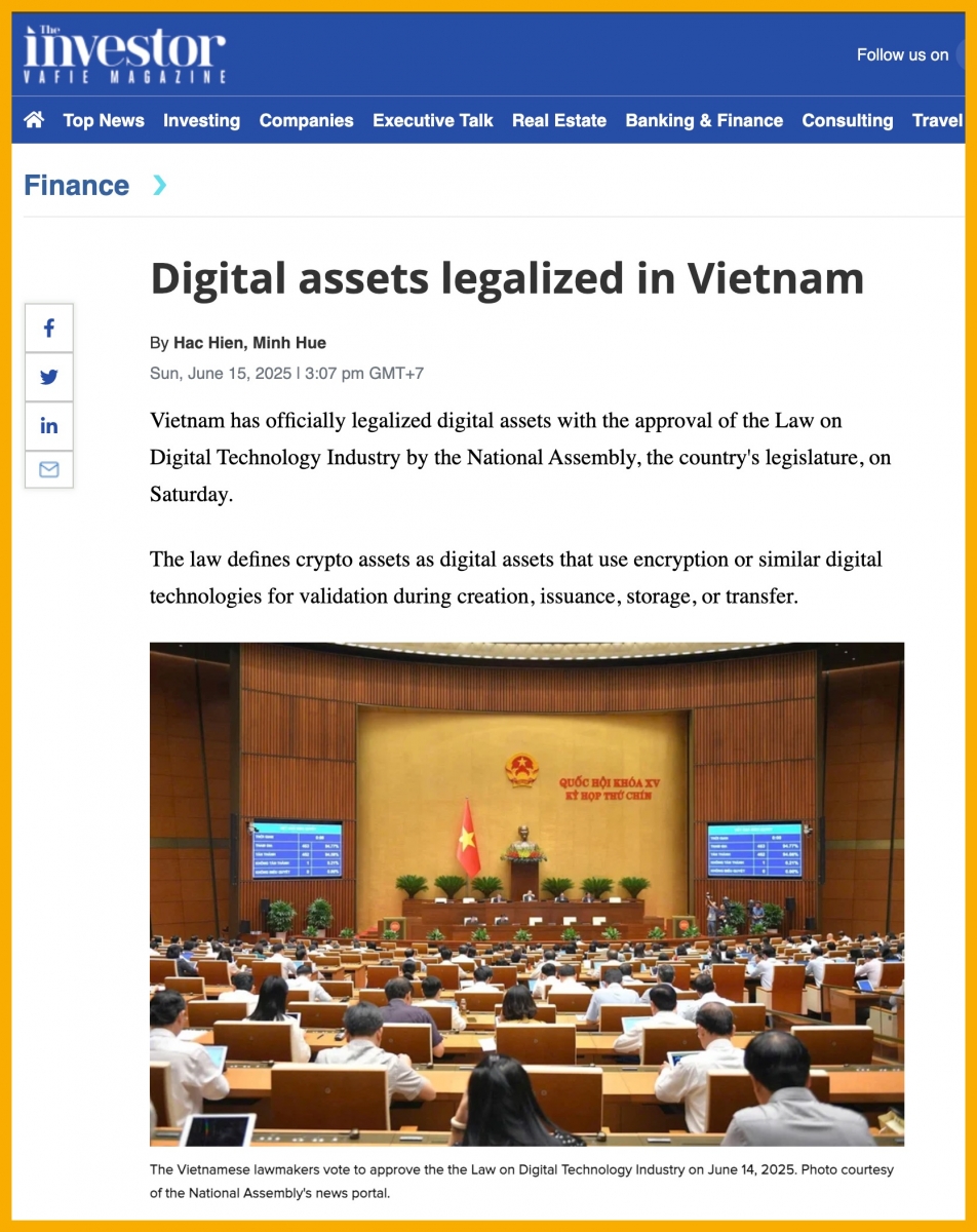 Việt Nam chính thức công nhận tài sản số trong luật mới sẽ có hiệu lực từ ngày 1/1/2026. Đây là lần đầu tiên tài sản số được hợp pháp hóa, tạo cơ sở pháp lý quan trọng cho sự phát triển của kinh tế số.