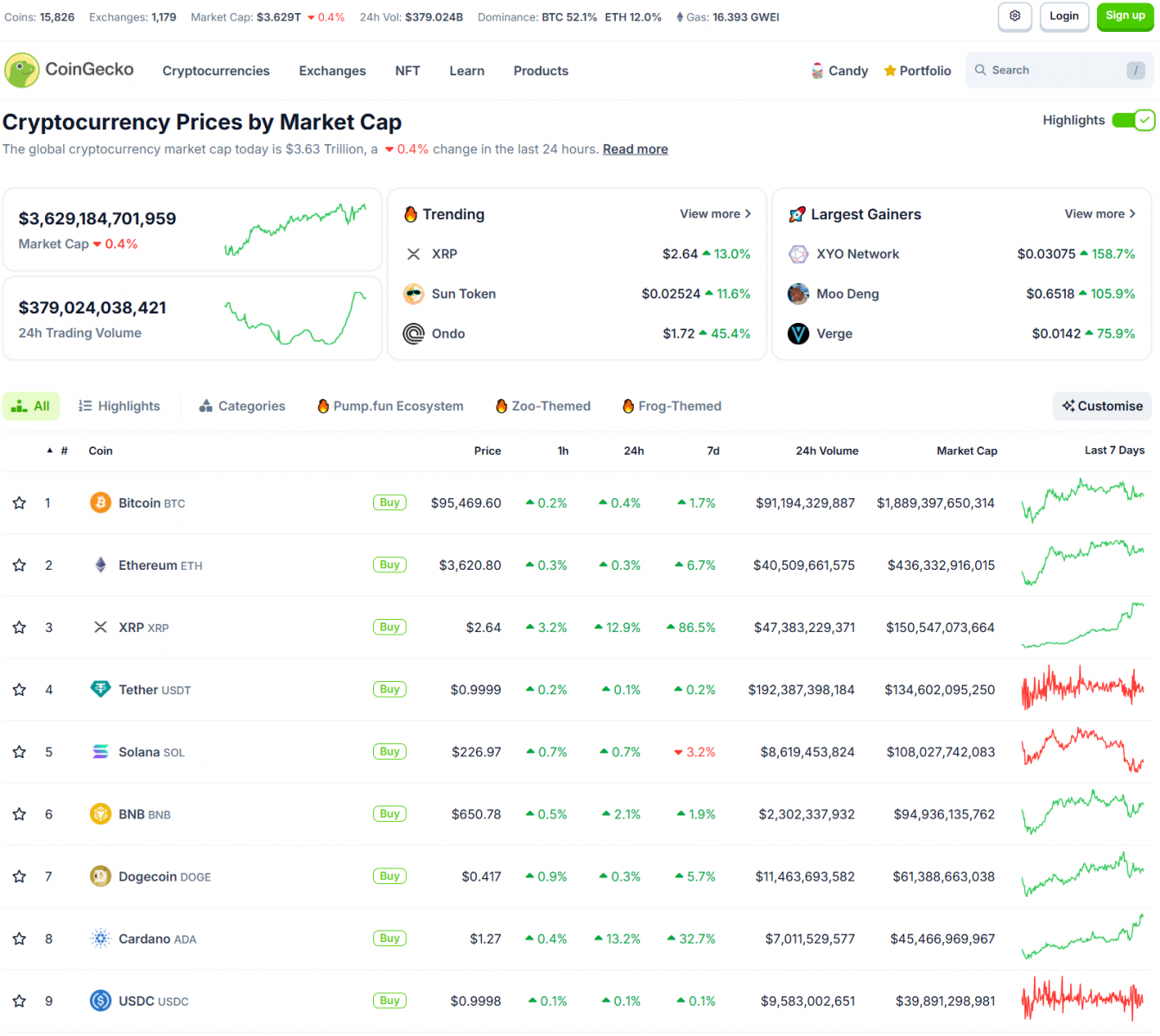 Còn BTC vẫn giữ quanh 95,000 USD. Các altcoin lớn tăng nhẹ, riêng XRP và ADA có sự tăng trưởng đáng chú ý hơn. Vốn hóa thị trường crypto là 3.629 nghìn tỷ USD.