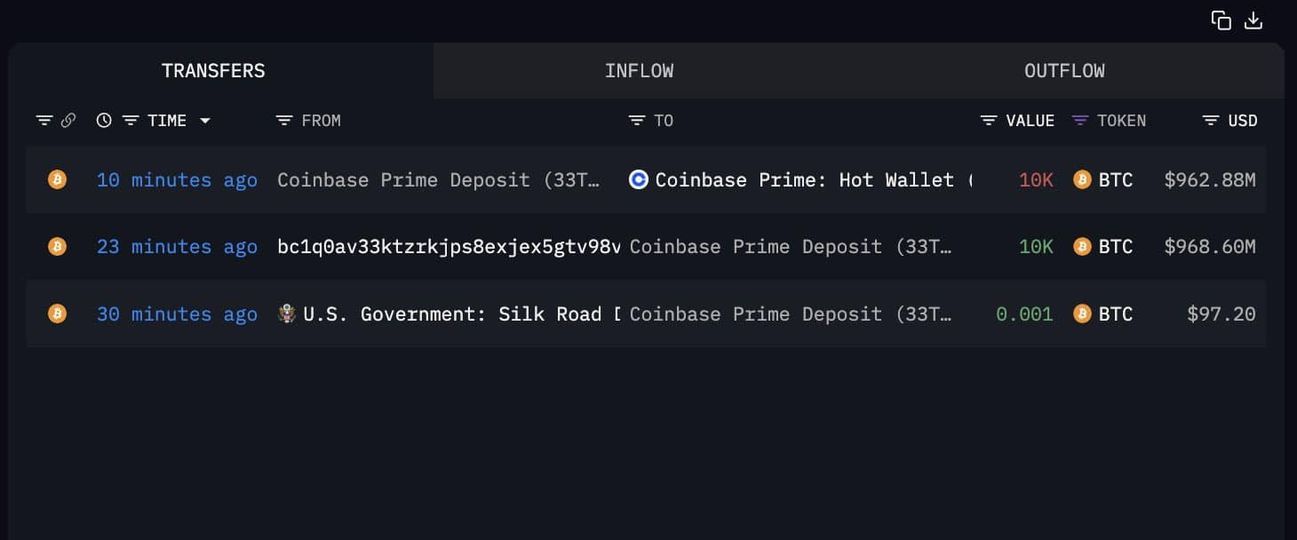 Có một thông tin khiến thị trường lo lắng ngày qua là chính phủ Hoa Kỳ di chuyển BTC lên sàn. Chính phủ Mỹ đã chuyển 10,000 Bitcoin (khoảng 963 triệu USD) lên Coinbase.