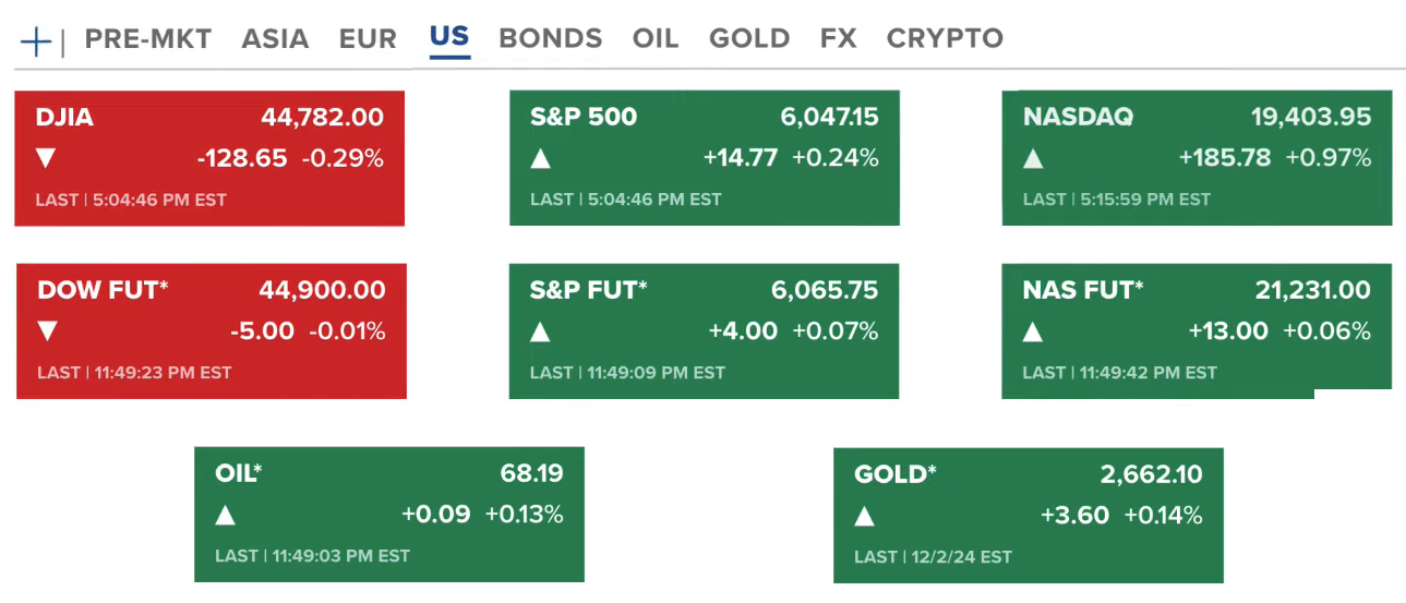 Chứng khoán Hoa Kỳ thứ hai (02/12) kết thúc với Dow Jones giảm 0.29%, hai chỉ số còn lại đều tăng với Nasdaq tăng gần 1%. Cả hai chỉ số S&P 500 và Nasdaq đều đạt mức cao kỷ lục trong ngày. Hợp đồng tương lai của chứng khoán nghiêng về xu hướng tăng. Giá vàng và dầu cũng tăng nhẹ lên quanh 2662 USD/ounce và 68 USD/thùng.
