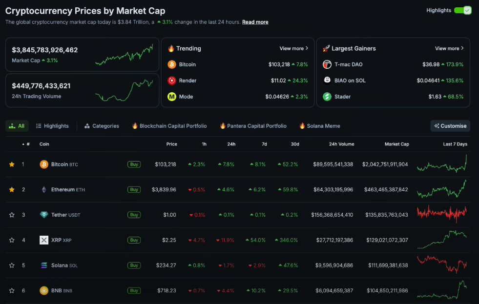 Bitcoin đã chính thức vượt 100,000 USD lên cao nhất là 103,000 USD. Đa số altcoin lớn tăng nhẹ. Vốn hóa thị trường crypto cũng tăng lên 3.8 nghìn tỷ USD.