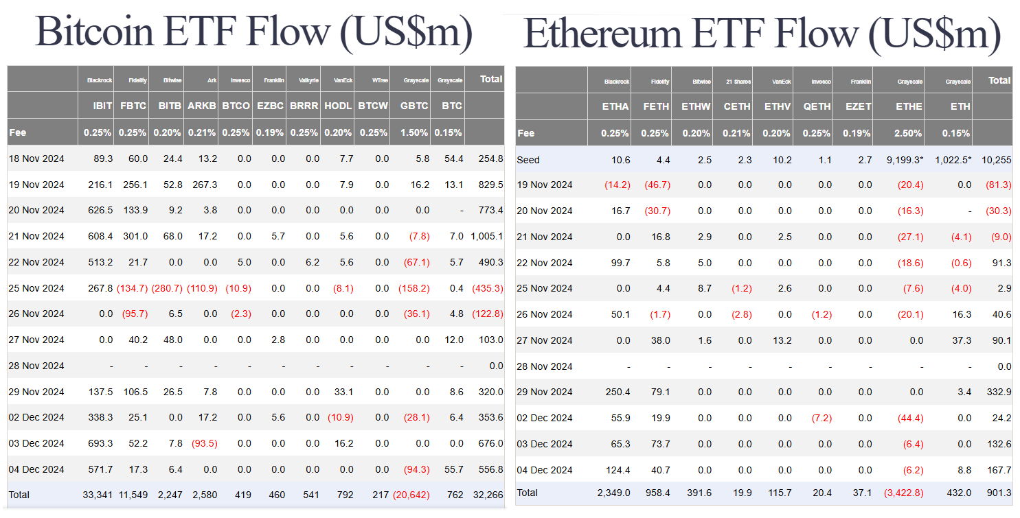 Các quỹ BTC spot ETF Hoa Kỳ đã có một phiên sôi động với dòng tiền vào lớn. Tổng dòng tiền của các quỹ BTC ETF trong thứ năm đạt 556 triệu USD, hầu hết trong đó đến từ IBIT của BlackRock. ETH spot ETF cũng có dòng tiền vào dương 167 triệu USD và cũng đến từ ETHA và FETH của BlackRock và Fidelity.