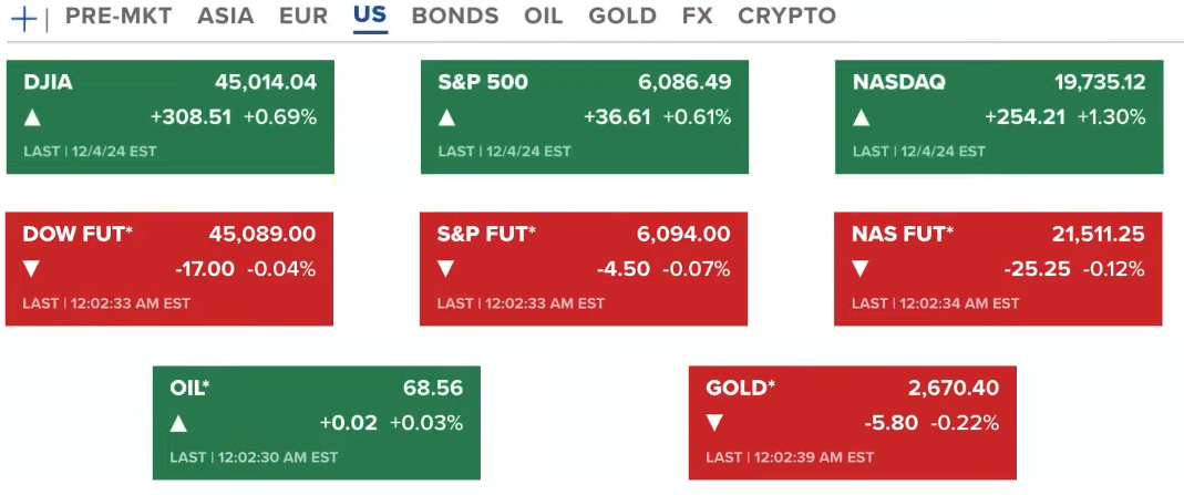 Chứng khoán Hoa Kỳ thứ năm (04/12) kết thúc với sự tăng trưởng ở cả ba chỉ số, riêng Nasdaq tăng nhiều nhất 1.3%. Hợp đồng tương lai của chứng khoán nghiêng về xu hướng giảm. Giá hợp đồng dầu ở quanh 68 USD/thùng. Vàng giảm nhẹ về 2670 USD/ounce.