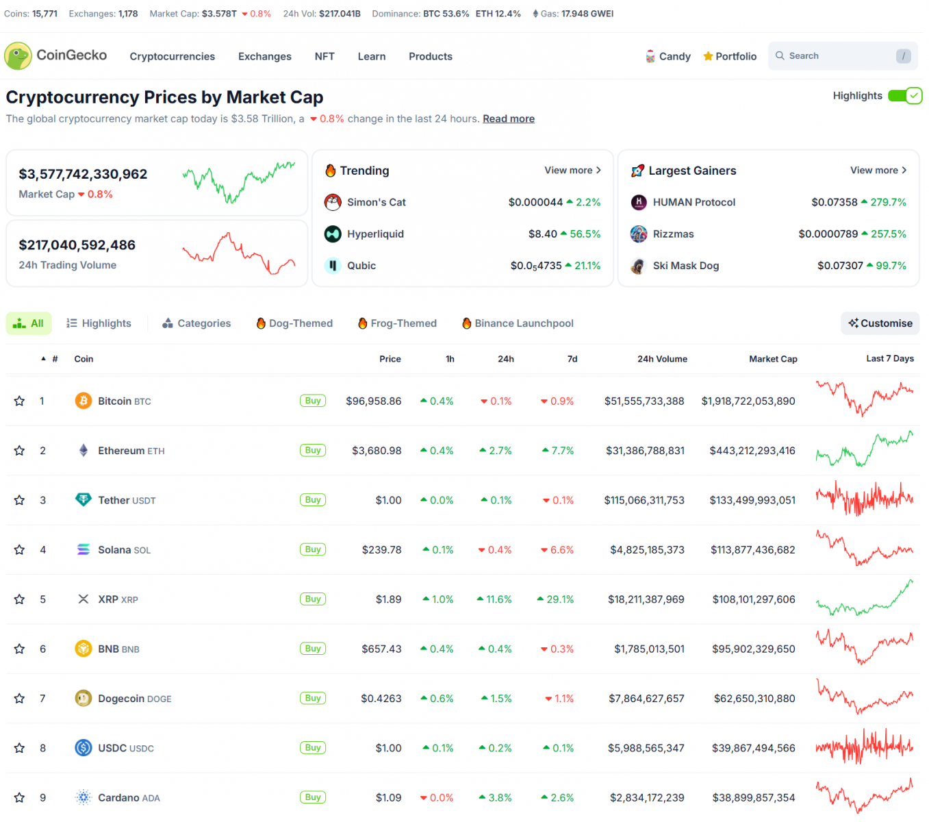 Bitcoin tiếp tục đi quanh 96,000 USD. Nhiều số altcoin tăng, trong đó có XRP tiến gần tới mức giá 2 USD, tăng hơn 250% trong tháng 11. Vốn hóa thị trường crypto là 3.577 nghìn tỷ USD.
