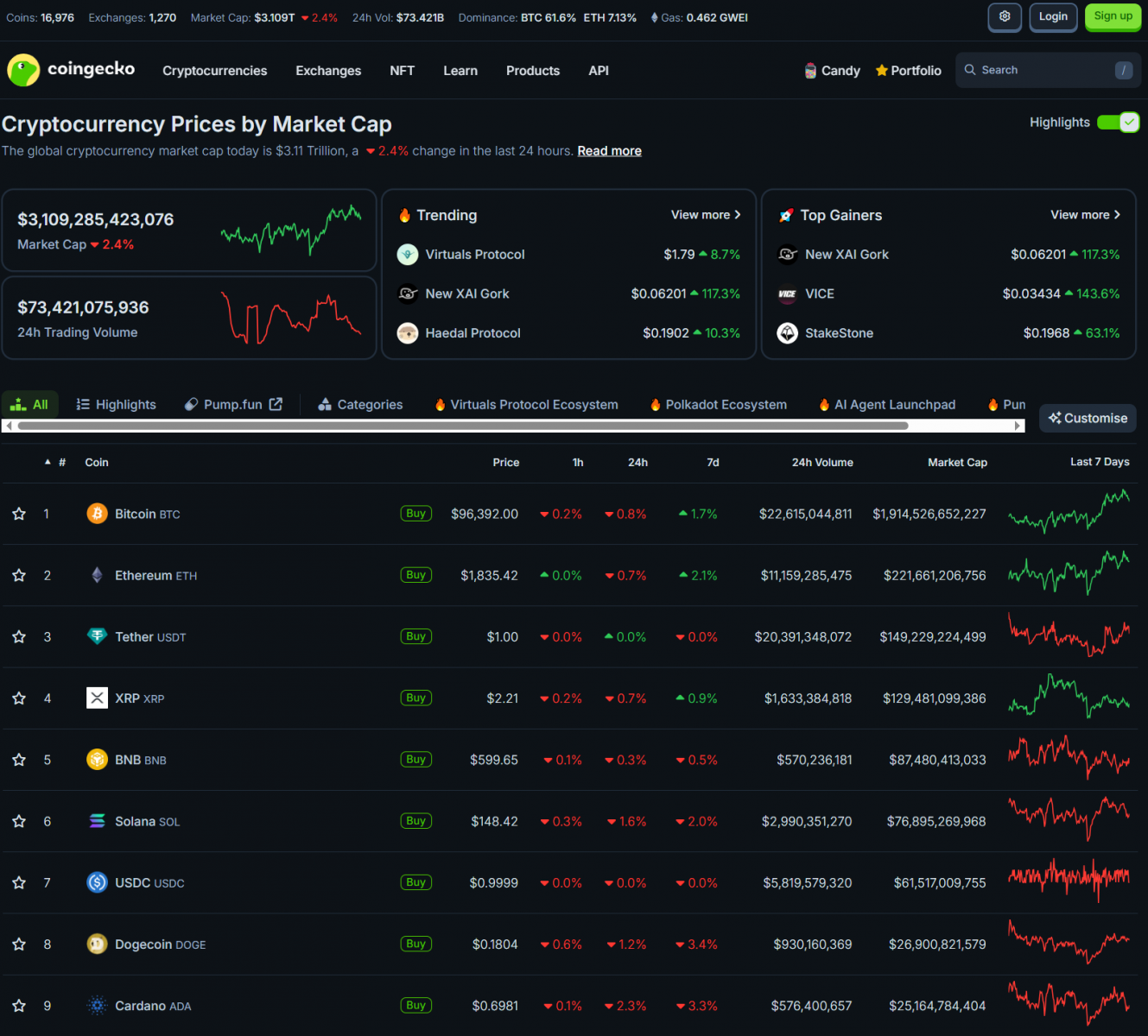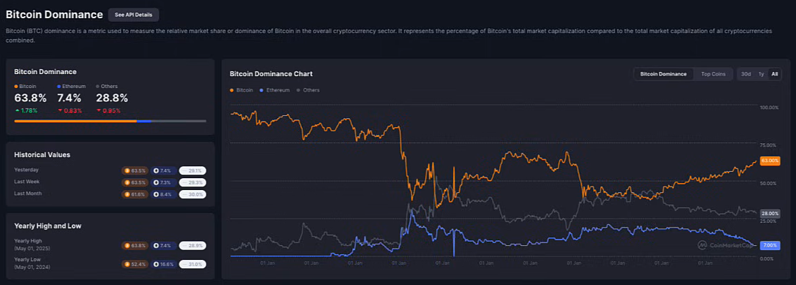 Gần đây, Bitcoin tiếp tục tăng trưởng mạnh, trong khi nhiều altcoin cũng tăng nhưng với tốc độ chậm hơn và không đồng đều. Tỷ lệ thống trị (dominance) của Bitcoin hiện đạt 63%, mức cao tương đương tháng 1/2021, cho thấy nhà đầu tư vẫn tập trung vào Bitcoin nhiều hơn so với altcoin. Dù một số altcoin đã có mức tăng đáng kể trong tháng qua (40–200%), nhiều người vẫn thất vọng do kỳ vọng cao hơn.