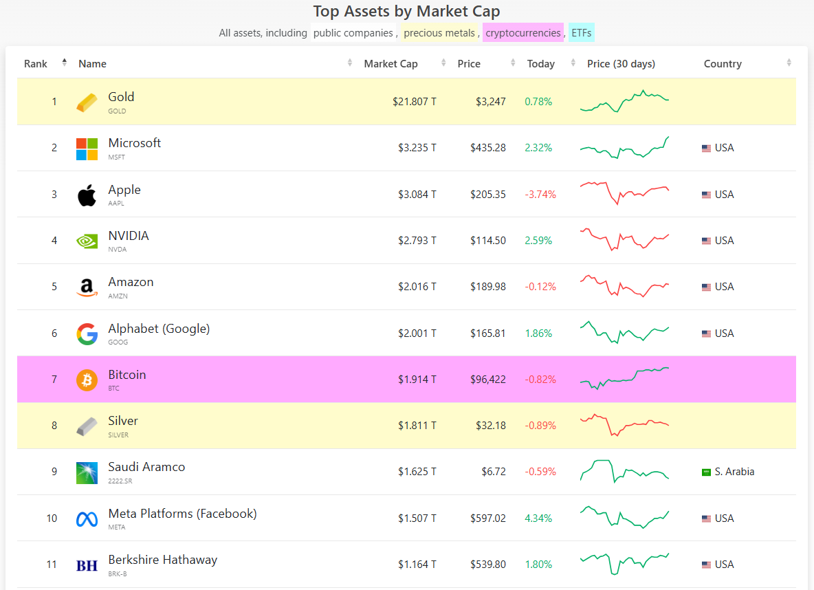 Với sự tăng trưởng, BTC đã trở thành tài sản lớn thứ bảy trên thế giới, vượt qua cả bạc.