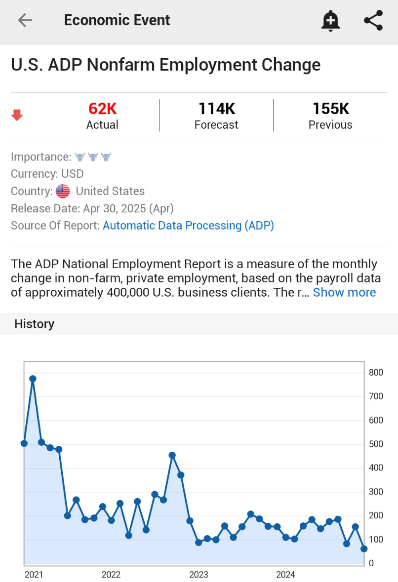 Trong khi đó, báo cáo việc làm phi nông nghiệp ADP tháng 4 chỉ ghi nhận 62,000 việc làm mới, thấp hơn nhiều so với kỳ vọng 114.000 và giảm mạnh so với mức 155,000 của tháng trước. Tuy nhiên, báo cáo chính thức từ Bộ Lao động lại cho kết quả tích cực hơn, với 177,000 việc làm mới, vượt xa ước tính 133,000. Điều này cho thấy thị trường lao động vẫn giữ được độ bền nhất định, dù kinh tế chung đang có dấu hiệu suy yếu.