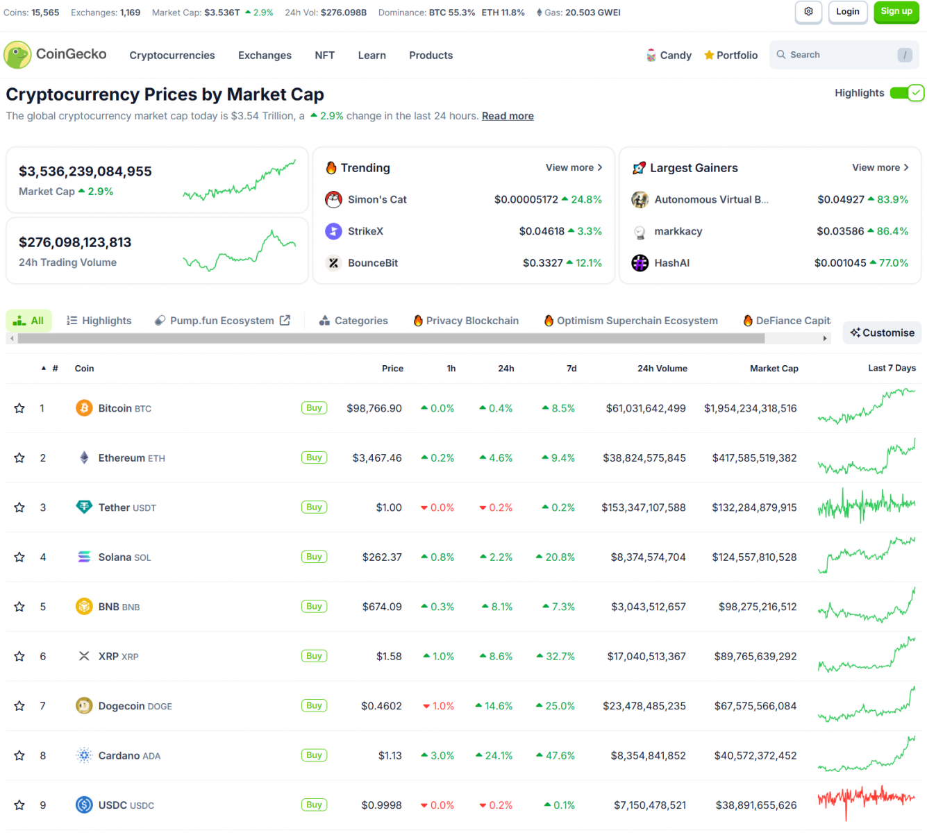 Bitcoin tiếp tục dao động quanh 98,000 USD và có những thời điểm giá đã rất gần nhưng chưa chạm được tới mốc 100,000 USD.Các altcoin lớn hầu hết đều tăng trưởng. Vốn hóa thị trường crypto là 3.5 nghìn tỷ USD.