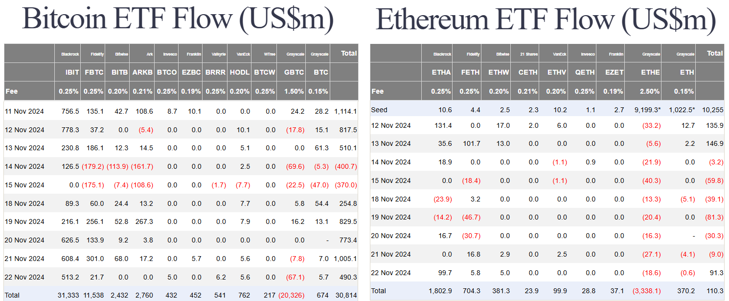 Các quỹ BTC spot ETF thứ sáu (22/11) kết thúc với dòng tiền vào dương 490 triệu USD. Dòng tiền vào phần lớn đến từ IBIT, quỹ GBTC của Grayscale có dòng tiền rời khỏi. Còn ETH spot ETF có dòng tiền vào dương 91 triệu USD sau nhiều phiên âm, với dòng tiền chủ yếu đến từ ETHA của BlackRock.