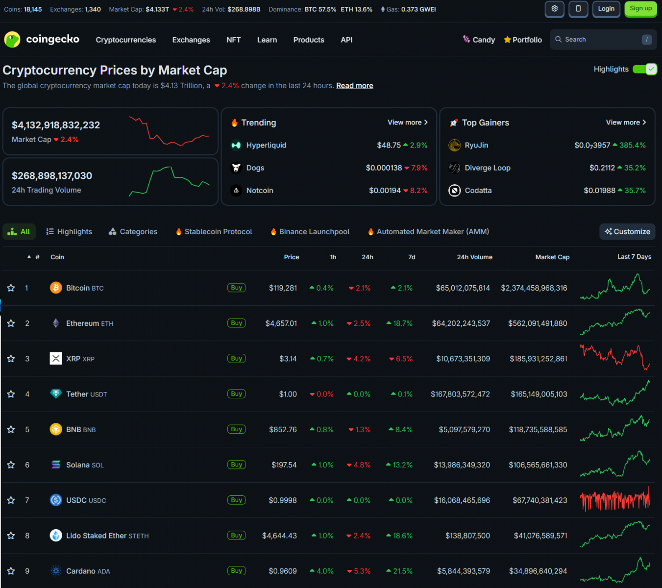 Bitcoin có sự điều chỉnh nhanh chóng từ mức đỉnh mới 124,000 USD xuống mức thấp 118,000 USD và sau đó về quanh 119,000 USD. Các altcoin lớn điều chỉnh nhẹ. Vốn hóa thị trường crypto ở mức 4.1 nghìn tỷ USD.