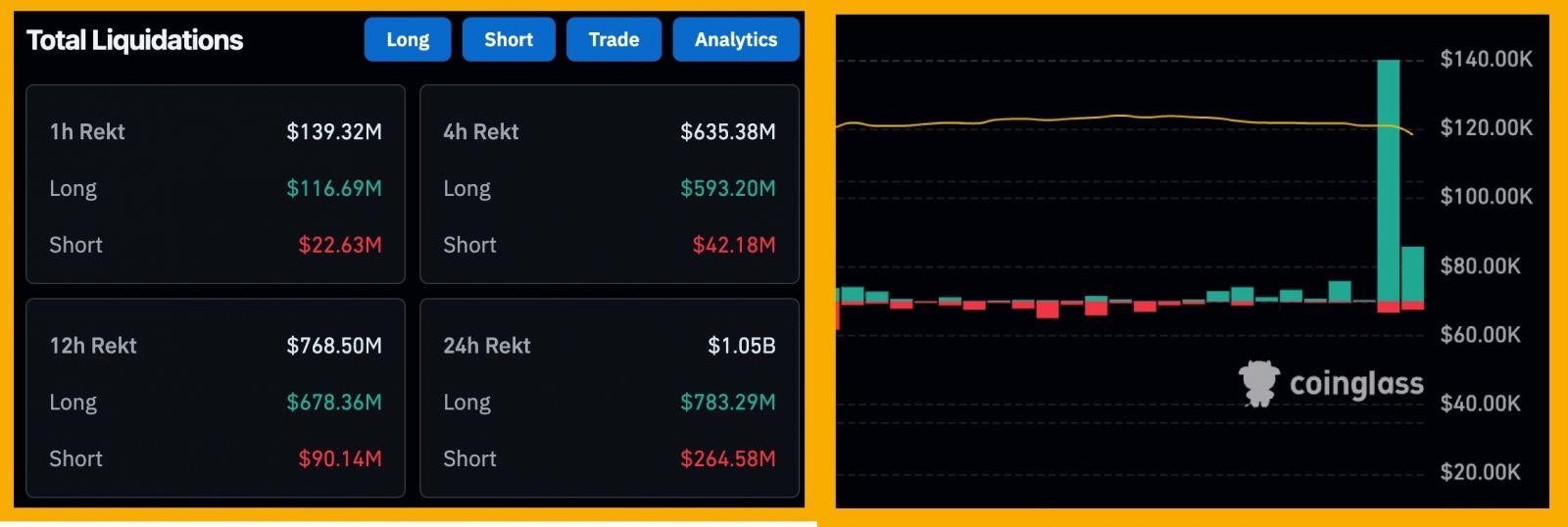Hơn 1 tỷ USD giao dịch đòn bẩy đã bị thanh lý trong 24 giờ qua, một nửa trong số đó bị xóa sổ chỉ trong chưa đầy 2 tiếng.
