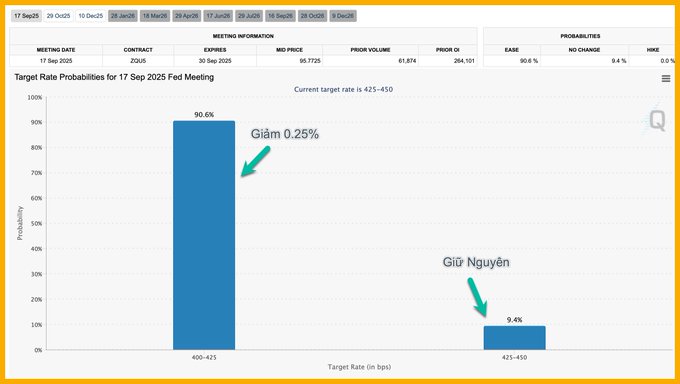 Mặc dù PPI không trực tiếp liên kết với CPI, dữ liệu này làm gia tăng lo ngại lạm phát sản xuất có thể lan sang giá tiêu dùng, từ đó ảnh hưởng tới kỳ vọng chính sách tiền tệ. Trước báo cáo, thị trường dự đoán Fed sẽ cắt giảm 0,5% lãi suất vào tháng 9, nhưng sau số liệu PPI, xác suất này đã giảm xuống 0%. Ở thời điểm Paolo chia sẻ, hơn 90% nhà đầu tư dự báo Fed sẽ cắt 0,25%, trong khi 9.4% cho rằng lãi suất sẽ giữ nguyên.