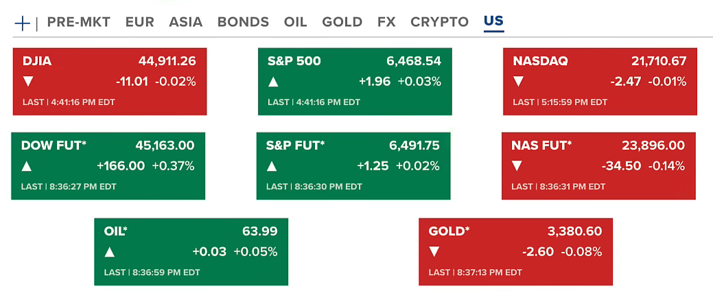 Thứ năm tại Hoa Kỳ (14/08), thị trường chứng khoán đi ngang sau phiên tăng mạnh trong thứ tư. Hợp đồng tương lai của chứng khoán có sự phân hóa, tăng ở DOW FUT, còn NAS FUT giảm. Hợp đồng dầu vẫn quanh 63.9 USD/thùng. Vàng ở mức 3380 USD/ounce.