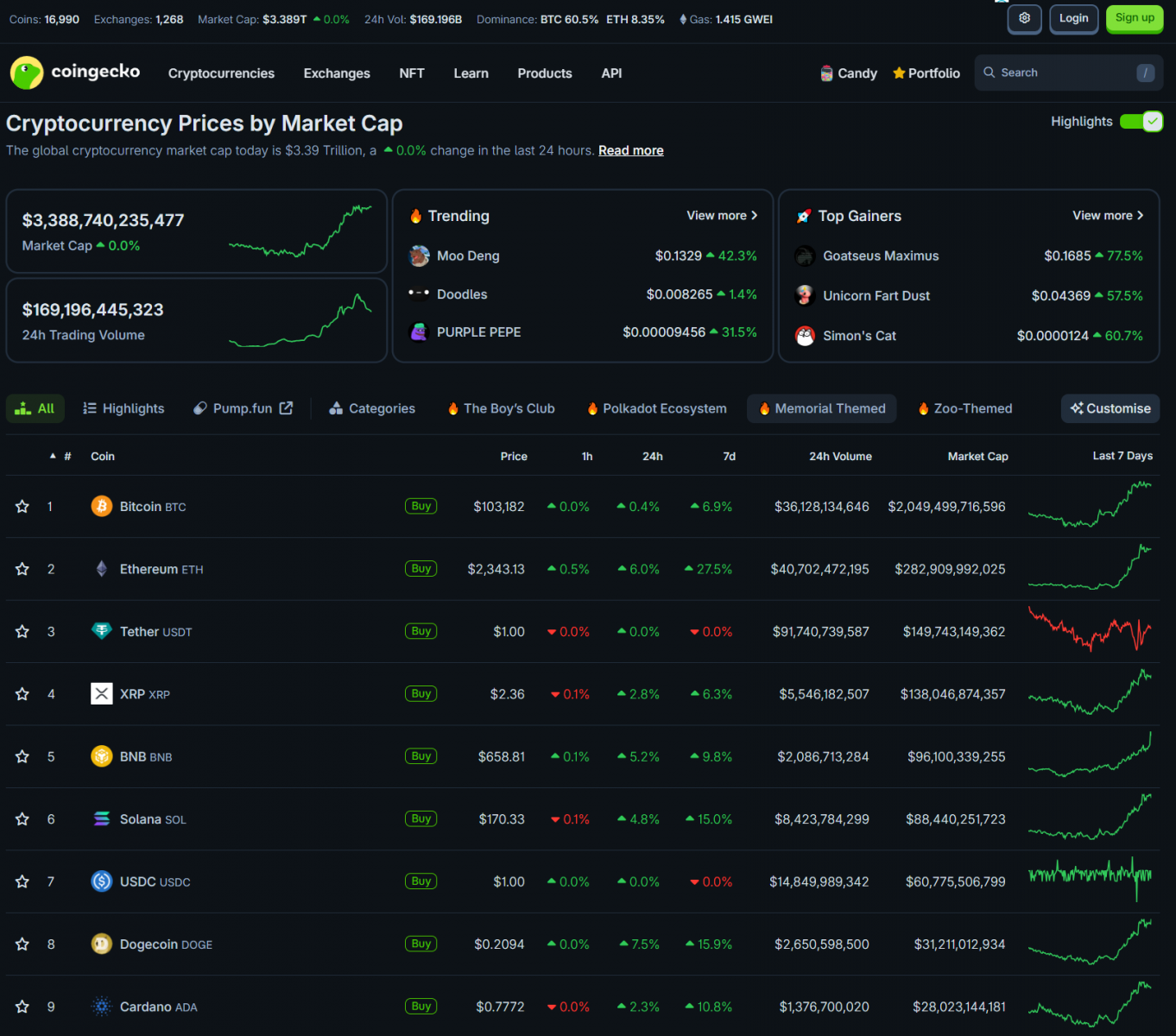 Bitcoin vẫn giữ quanh 103,000 USD. Nhiều altcoin top 10 vẫn tăng đáng kể như ETH, SOL, DOGE. Vốn hóa thị trường là 3.388 tỷ USD.
