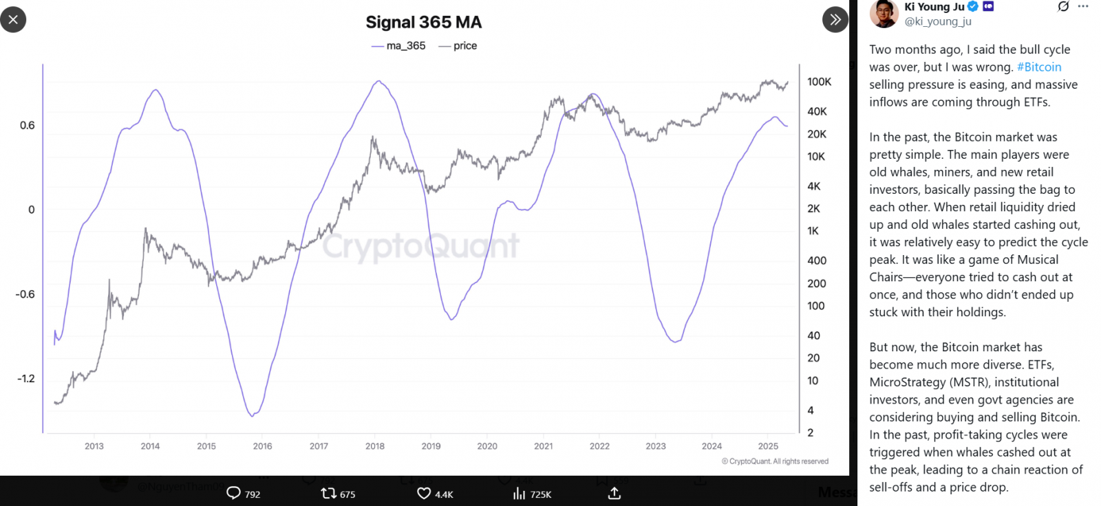 CEO của CryptoQuant thừa nhận ông đã sai khi tuyên bố bull market của Bitcoin đã kết thúc cách đây hai tháng. Kể từ đó, áp lực bán đã giảm và dòng tiền đổ vào từ các quỹ ETF ngày càng mạnh. Ông giải thích rằng trước đây thị trường Bitcoin khá đơn giản, chủ yếu do các cá voi lâu năm, thợ đào và nhà đầu tư nhỏ lẻ chi phối.