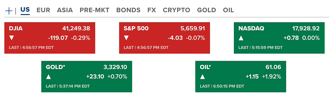 Chứng khoán Hoa Kỳ thứ sáu (09/05) kết thúc phiên với Dow Jones giảm 0.29%, S&P 500 giảm không đáng kể 0.07%, còn Nasdaq đi ngang. Hợp đồng vàng vẫn ở mức cao 3329 USD/ounce. Dầu tăng lên 61 USD/thùng.