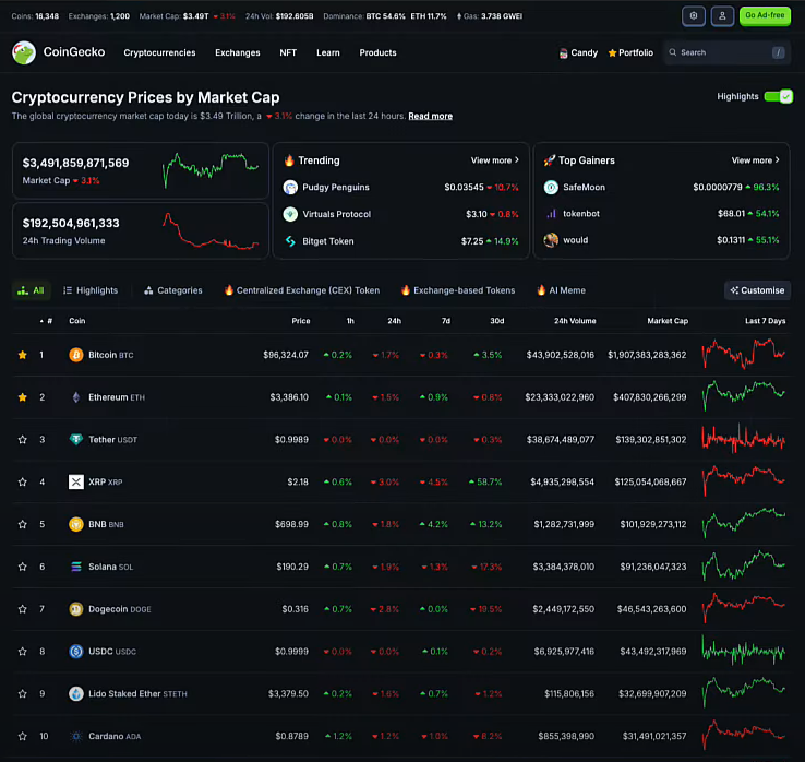 Bitcoin vẫn tiếp tục dao động và quanh mức 96,000 USD. Đa số các altcoin lớn giảm. Vốn hóa thị trường crypto ở mức 3.491 nghìn tỷ USD.