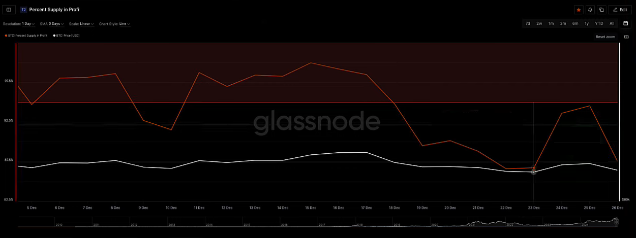 Tỷ lệ BTC có lời đã điều chỉnh về 87.52% khi giá BTC giảm.