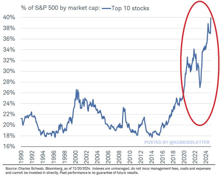 Top 10 cổ phiếu hiện chiếm tỷ trọng kỷ lục 40% tổng vốn hóa thị trường của S&P 500. Tỷ lệ này hiện đã vượt mức bong bóng Dot-Com năm 2000 khoảng 14%. Trong năm 2024, các cổ phiếu này đã tăng thêm hơn 7 nghìn tỷ USD vào vốn hóa thị trường và hiện đạt mức kỷ lục 20.9 nghìn tỷ USD.