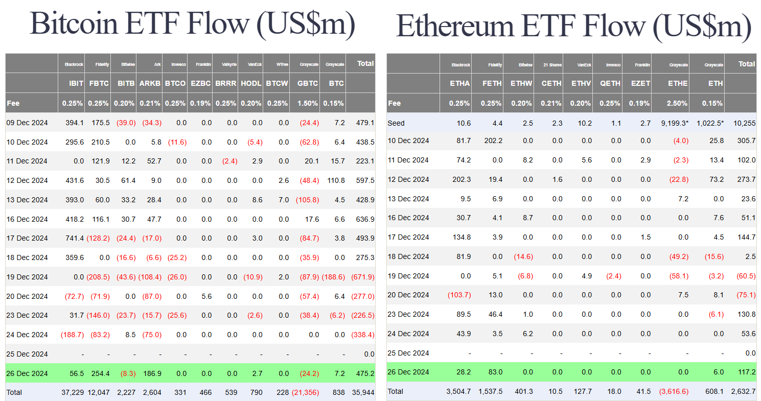 Các quỹ BTC spot ETF Hoa Kỳ đã có dòng tiền dương trở lại trong thứ năm (26/12) với 475 triệu USD. Trong đó, quỹ FBTC và ARKB có dòng tiền vào lớn nhất. Còn ETH spot ETF có dòng tiền vào dương 117 triệu USD. ETH ETF cũng đã bắt đầu thu hút được dòng tiền vào. Nhiều quỹ và nhà đầu tư cũng đã dần đa dạng hóa đầu tư vào ETH ETF.