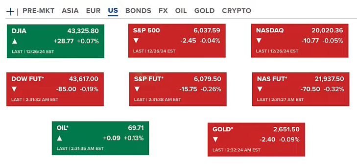 Chứng khoán Hoa Kỳ thứ năm (26/12) đi ngang, có hai chỉ số S&P 500 và Nasdaq nghiêng về xu hướng giảm. Hợp đồng tương lai của chứng khoán giảm nhẹ. Hợp đồng dầu ở quanh 69 USD/thùng. Còn vàng quanh 2651 USD/ounce.