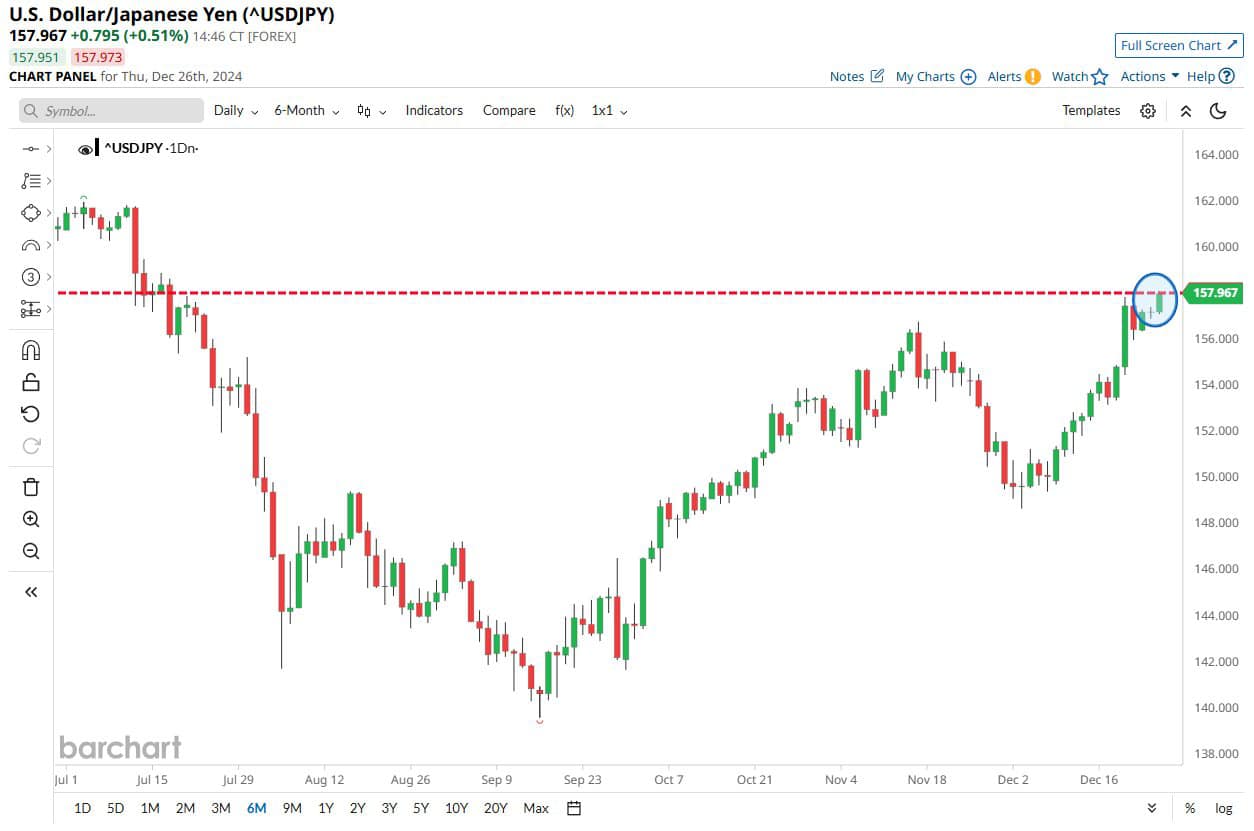 Trong khi đồng USD mạnh, Đồng Yên Nhật hiện đã giảm xuống mức 158 so với USD và đang ở mức yếu nhất kể từ tháng 7 (source X @ Barchart). Ngân hàng trung ương Nhật Bản đang rơi vào tình thế tiến thoái lưỡng nan, hoặc tiếp tục chứng kiến đồng Yên suy yếu, hoặc tăng lãi suất và đối mặt với nguy cơ suy thoái kinh tế.