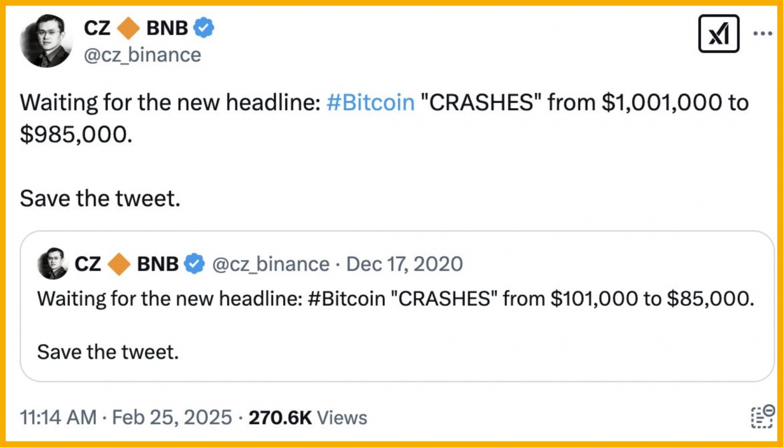 CZ: “Đang chờ ngày tiêu đề báo nói: #Bitcoin ‘SẬP’ từ $1,001,000 xuống $985,000.”