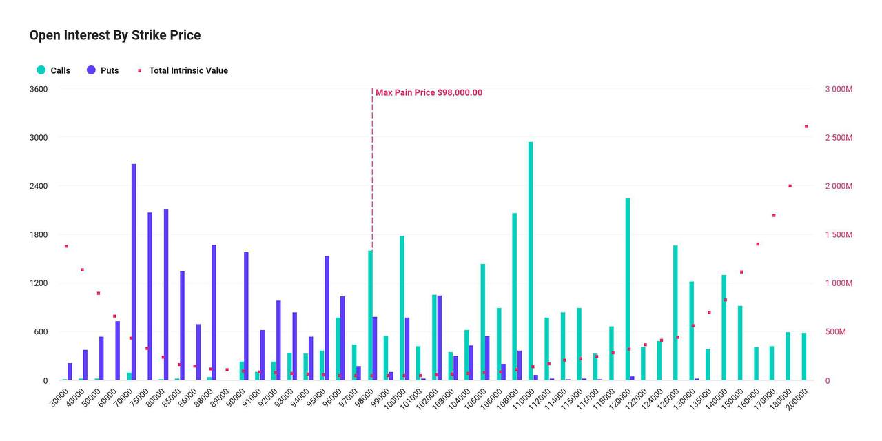 Tuần này cũng có lượng lớn hợp đồng option của BTC và ETH đáo hạn lúc 15h (VN) thứ sáu (tức 00:00 sáng Cali) số lượng 55,000 BTC (khoảng 4.9 tỷ USD) sẽ đáo hạn trên Deribit. Giá Maxpain tại 98,000 USD. Đối với Ethereum giá Maxpain tại 3,000 USD và tổng hợp đồng giá trị 1.24 tỷ USD.